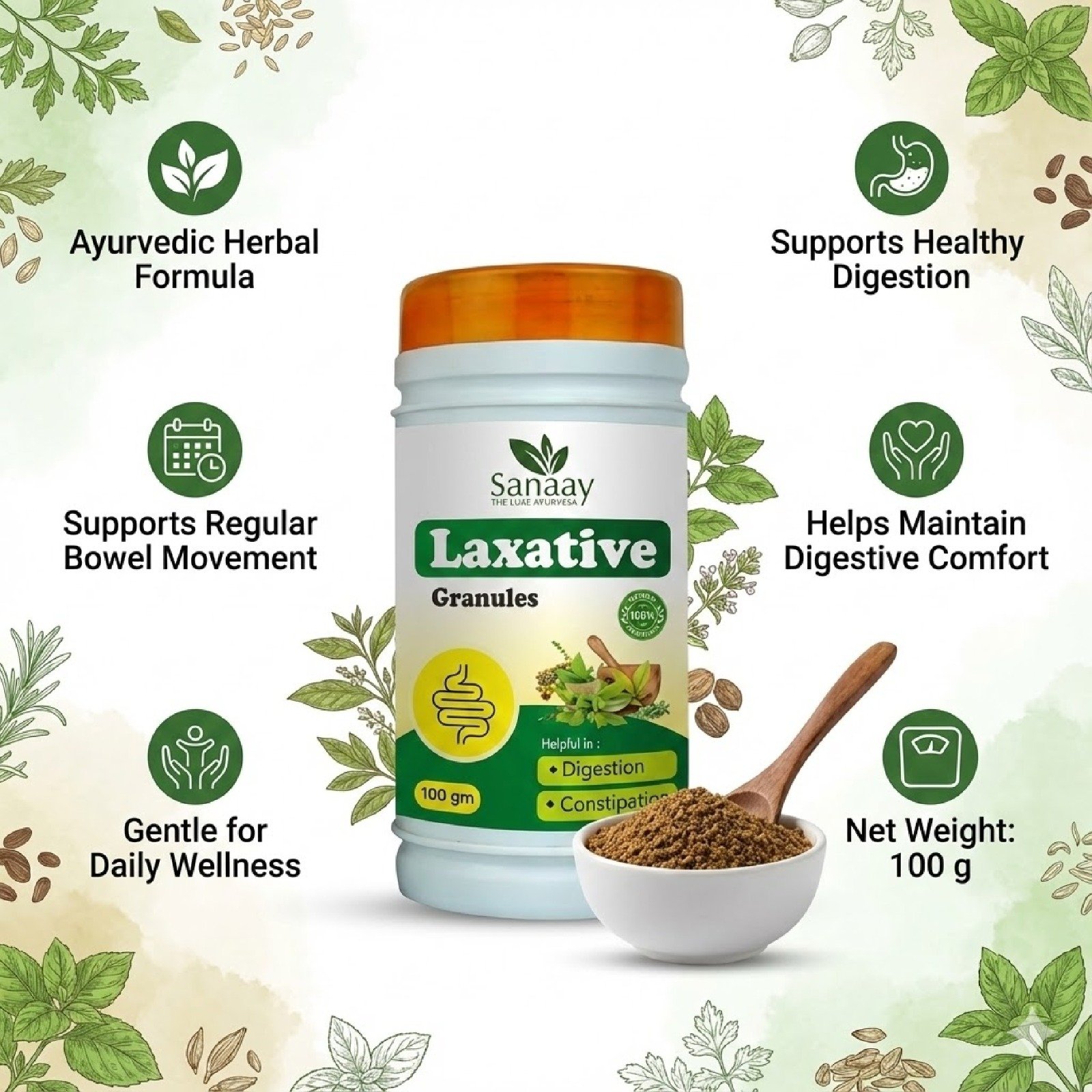 Experience natural digestive comfort with Sanaay Laxative Granules, a gentle Ayurvedic herbal formula designed to support healthy digestion and relieve constipation. Made with carefully selected natural ingredients, these granules help promote regular bowel movements, reduce bloating, and support overall gut health. Safe for regular use, this mild and effective blend works in harmony with your digestive system without causing dependency or harsh discomfort. Ideal for individuals experiencing sluggish digestion, acidity, or irregular bowel habits. Sanaay Laxative Granules help maintain internal cleansing and digestive balance, making it a reliable daily wellness supplement for improved gut function and overall wellbeing.